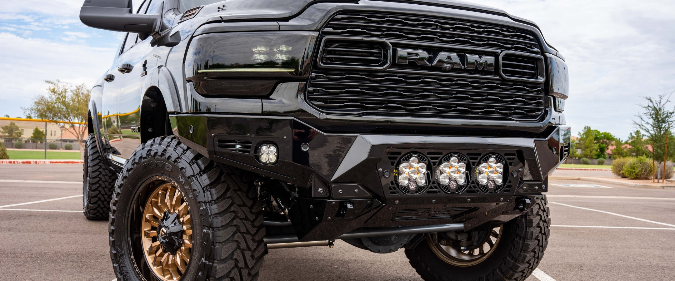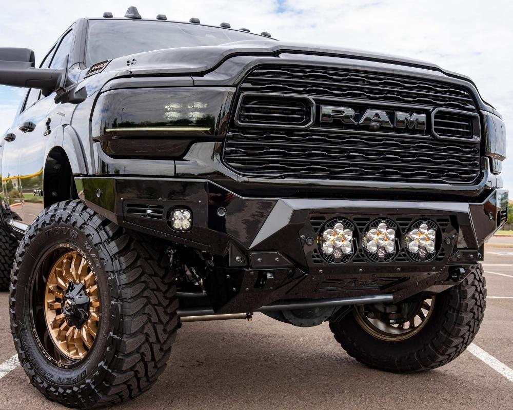 This SDHQ Built Ram 3500 is outfitted with a Carli 3.0 Dominator Suspension System, Carli Fabricated Radius Arms, Fuel Wheels, Baja Designs LED Lights, Toyo M/T Tires, and SDHQ Built products.
