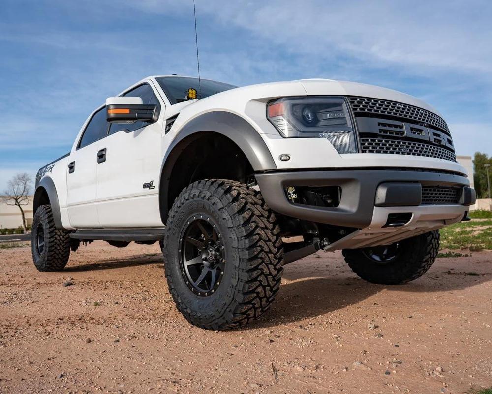 This First Gen Raptor is equipped with a Icon Vehicle Dynamics Stage 4 suspension system, 17" ICON Alloy Rebound Wheels, 35" Toyo M/T Tires, Whipple Supercharger, Baja Designs Squadron Pros, SDHQ Built A-Pillars, and a custom bumper fabricated by SDHQ.