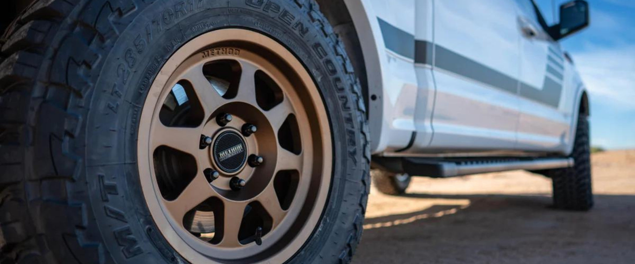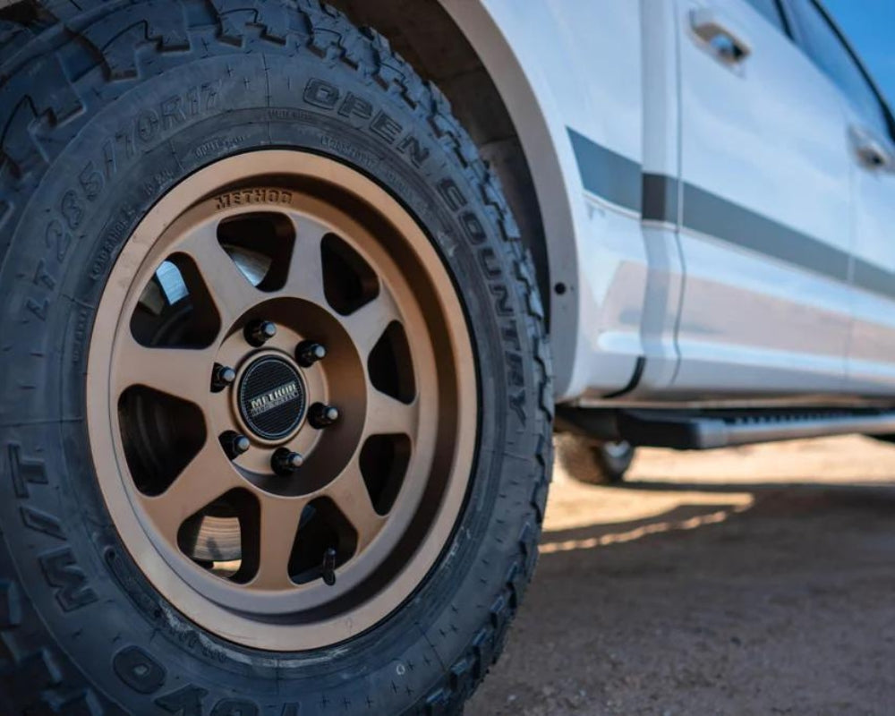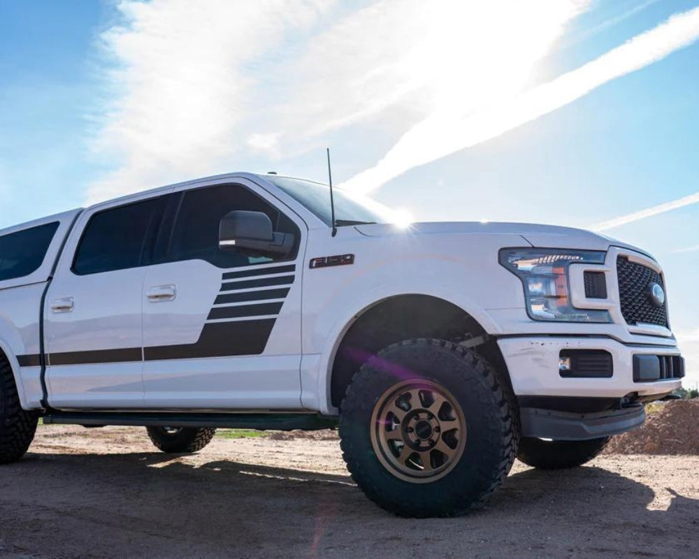 Jame's Ford F150 is equipped with a stage 3 Icon Vehicle Dynamics suspension system, Method 701 Series Wheels, and Toyota Open Country M/T Tires.