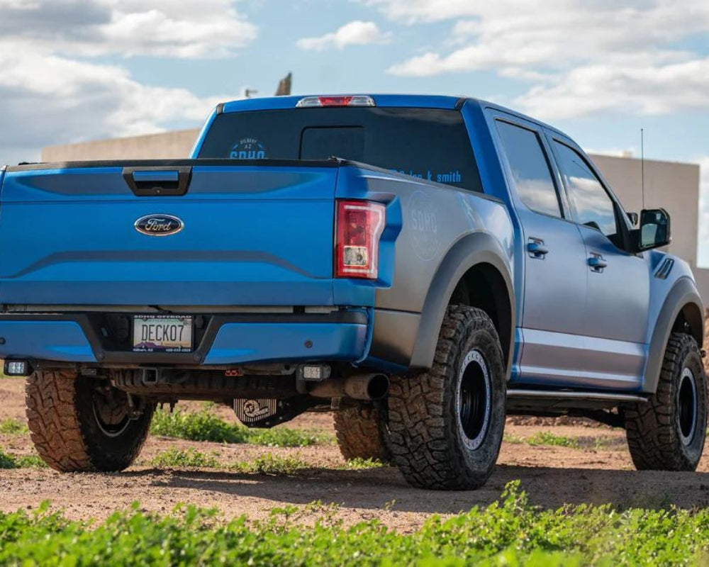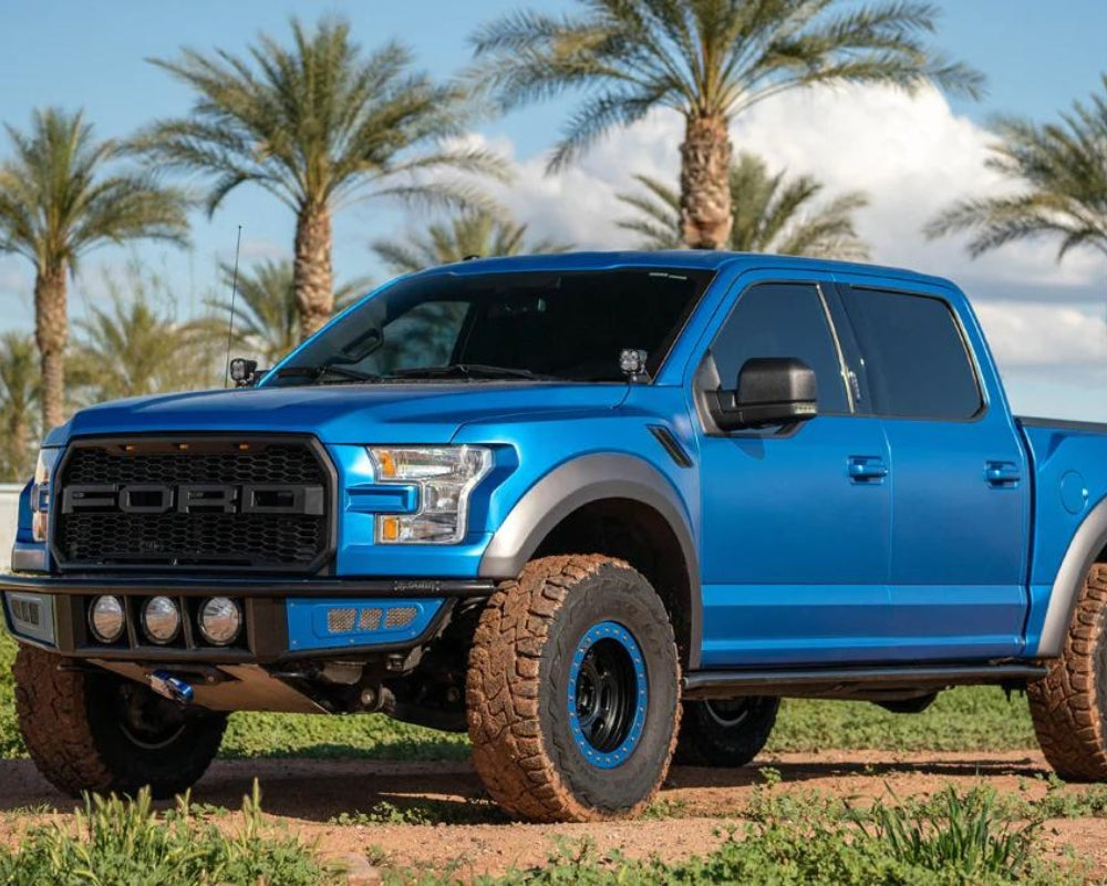 Kelly's 2015 F150 was outfitted with an Icon Vehicle Dynamics Suspension System, SDHQ Built A-Pillars, a custom front bumper, Baja Designs and Vision X LED lighting, AMP Powersteps, Walker Evan's Wheels, Toyo R/T Tires and to top it all off we did a full color change wrap on this F150.