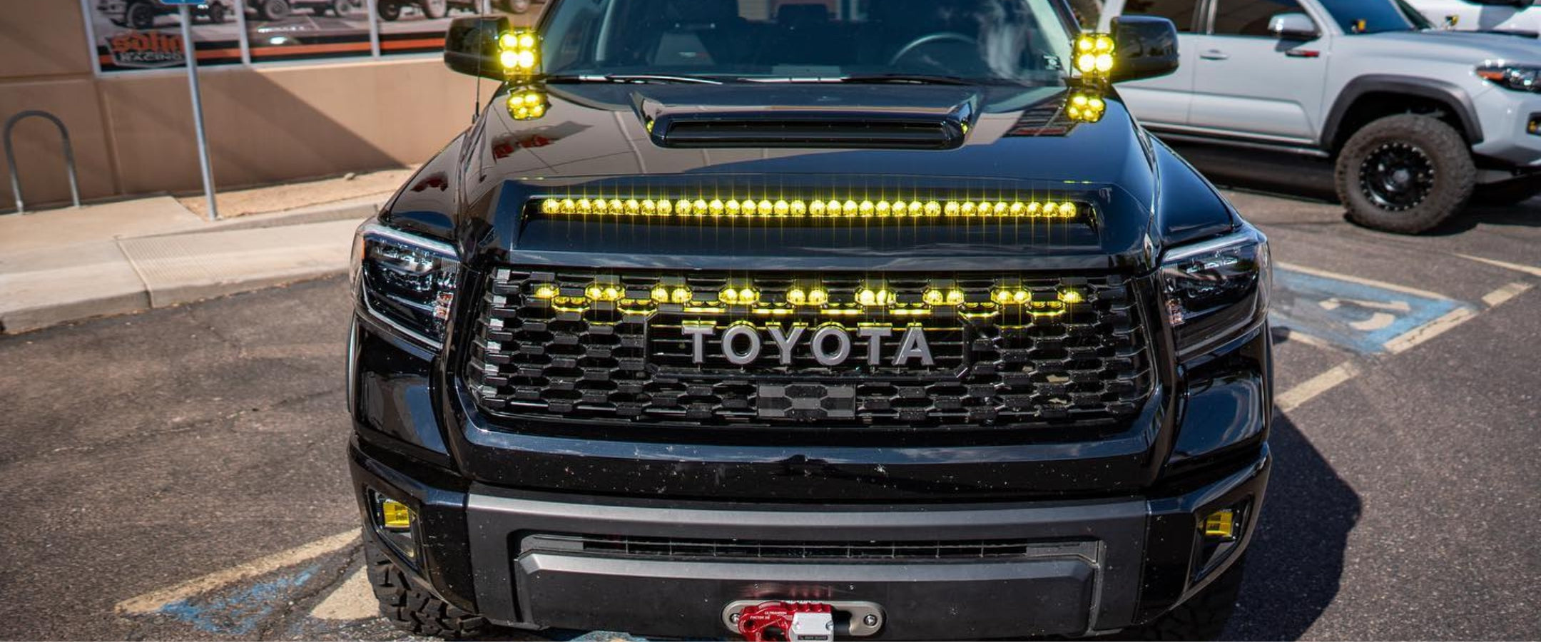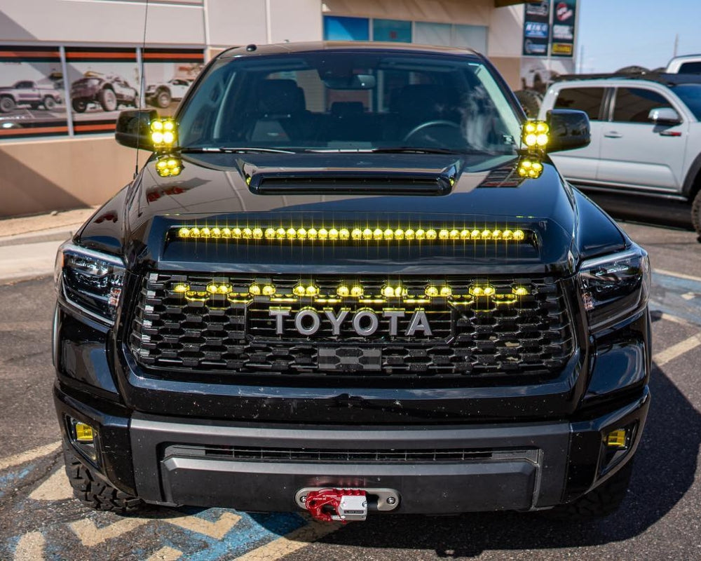 This Tundra is equipped with SDHQ Built Hood Scoop Mount, SDHQ Built Behind the Series Grille Mount, SDHQ Built A-Pillar Light Mounts, SDHQ Built Hidden Winch Mount, Baja Designs LED Light Bars and Auxiliary Lights, Warn Winch, SP-9100 with your SDHQ Built Power Module mount and Shifter Panel Keypad mount.